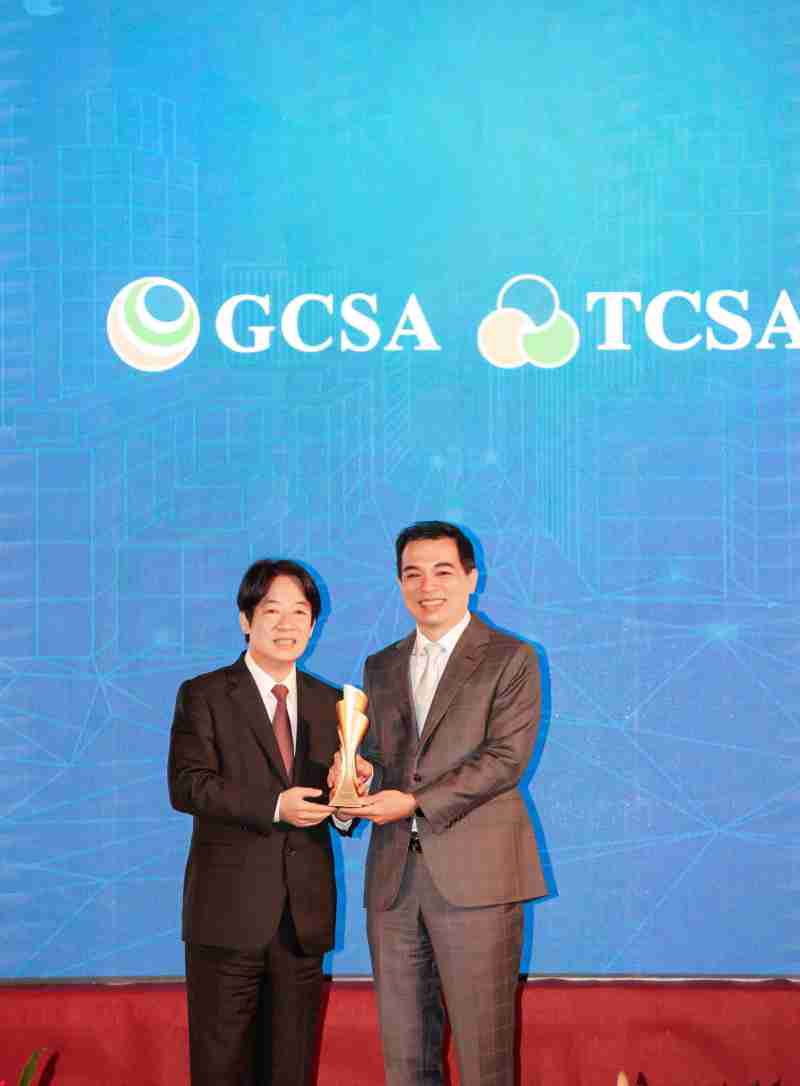 达全方位永续表现获全球永续奖及台湾永续奖肯定,,,由副总统赖清德颁奖 (左),,,,918.COM总经理柯富仁 (右) 代表领奖