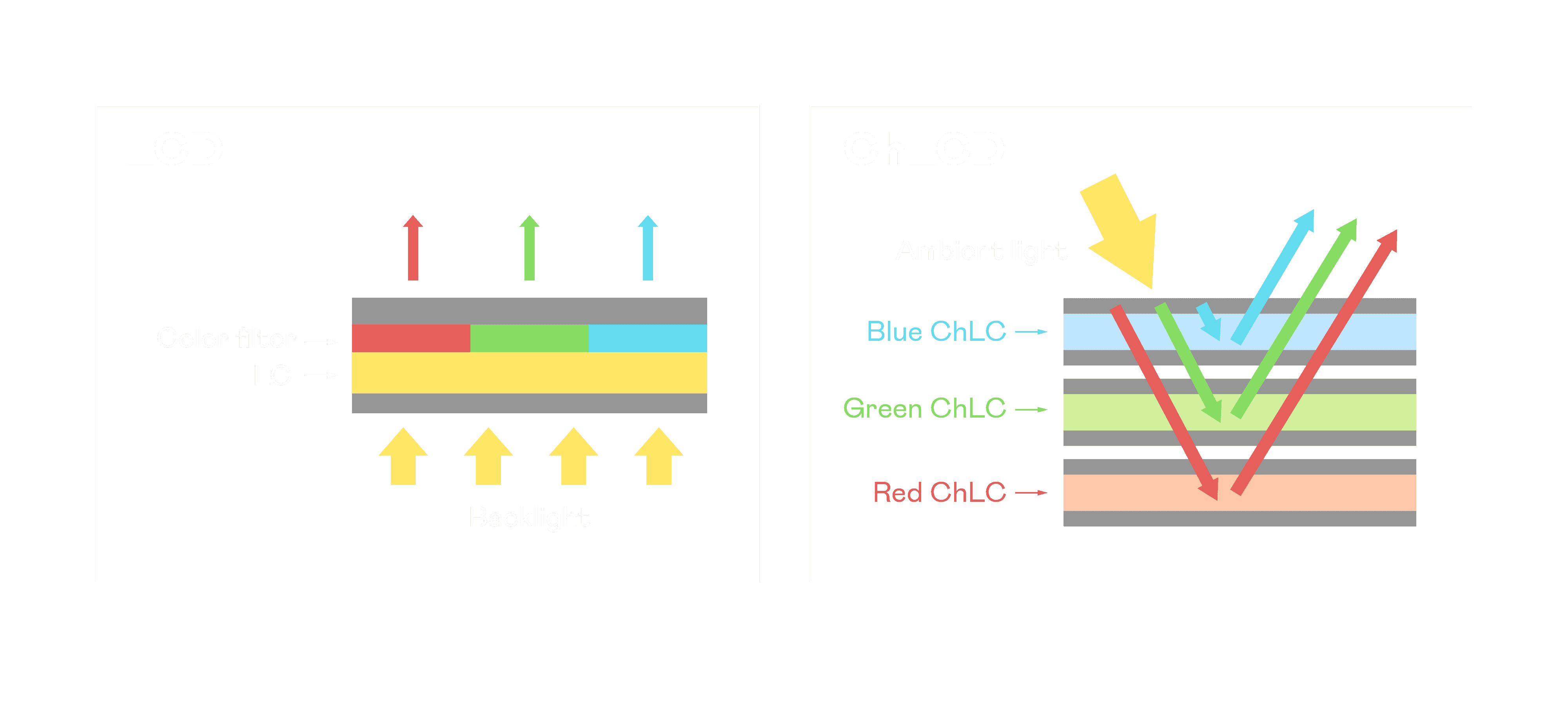 ChLCD 胆固醇液晶就如同纸张一样,,透过反射环境光来显示影像,,,因此长时间观看不易造成人眼视觉疲劳,,,,可达到护眼效果。。当处于户外阳光下使用,,,LCD 影像容易失真而不易观看,,,但胆固醇液晶仍可维持较佳的影像品质。。